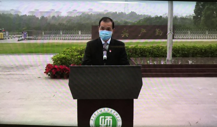 升旗仪升旗仪式后,伍世亮校长在国旗下通过“云”端连线,向全校师生发表了题为《同心战“疫”,学以报国》的春季开学致辞,寄语全校师生:1.生活是人生最好的老师,懂得敬畏生命,尊重自然,学会敬畏和珍惜;2.健康是人生最宝贵的财富,应自觉养成良好的学习、生活和锻炼的习惯;3.慎独是人生的最高境界,越是特殊时期,越应坚定自律。