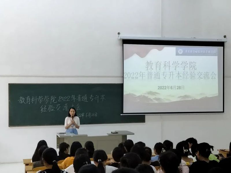 为贯彻落实我省和我校相关就业创业工作精神,为进一步提升我院普通专升本教育工作质量,提高同学们对普通专升本的相关政策的认识,做好成功经验的传承,6月28日下午,教育科学学院在慎取厅召开了2022年普通专升本经验交流大会。教育科学学院院长吴国彬、副院长张少红、辅导员江思敏以及200多名学生参加了会议。此次交流会特别邀请了在2022年普通专升本考试中取得优异成绩的4名同学进行经验分享,本次会议由江思敏老师主持。