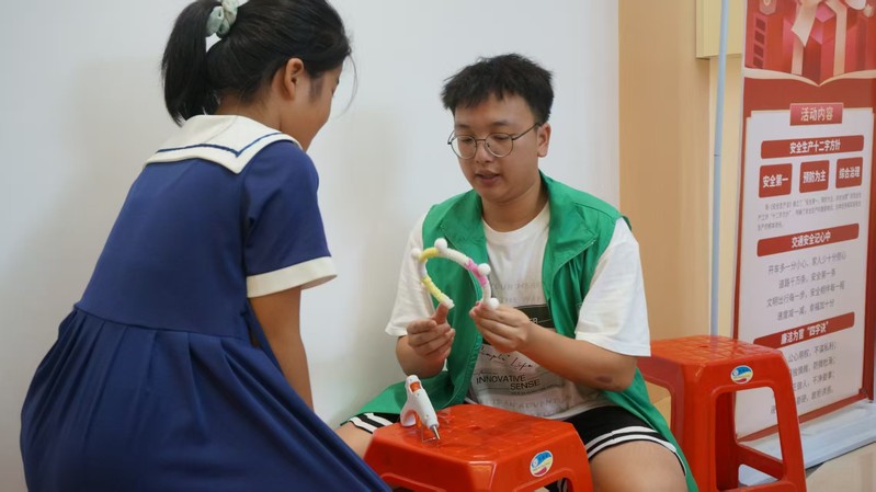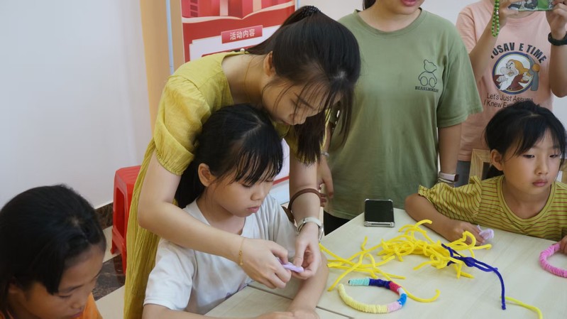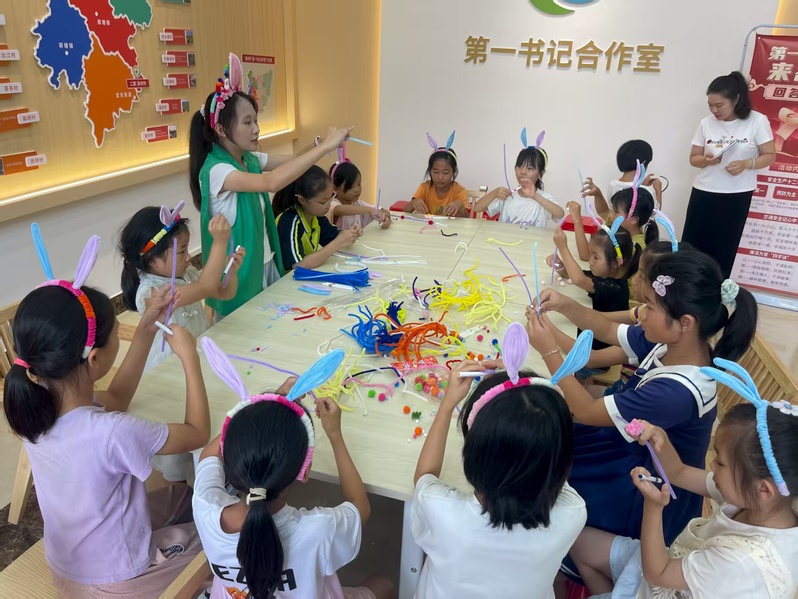 7月17日,突击队队员怀揣着热忱与期待,走进南塘镇彭村,开启了一场别开生面的文化传承之旅。活动中,彭村党群书记向孩子们逐一介绍突击队队员带来的手工作品,带领大家深入探寻扭扭棒、书签、扎染等传统与创意结合的手工艺术,细致讲解每种工艺的制作方法与背后的文化意趣。