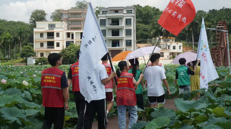 此外,突击队队员还前往彭村特色产业莲花池开展实地考察,沿着池边步道观察莲叶田田的景致,听着莲花种植与加工的产业故事,深入了解彭村将生态资源转化为文化特色的发展路径。期间,队员们与广东石油化工学院“彭村竹语织心”实践团深入交流,分享各自在文化传承、乡村服务中的实践经验与心得体会,在思想的碰撞中凝聚起扎根基层、奉献青春的共识。