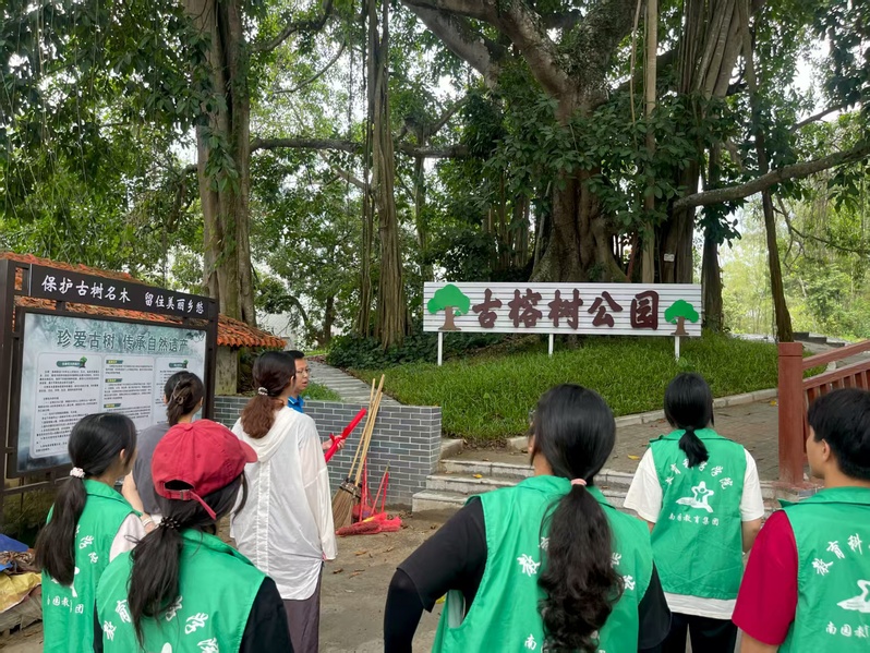 原来,古榕树公园是洪山村推进乡村振兴的生动实践——依托村内古榕树群优势,打造出集生态休闲、文化展示于一体的小公园,成为乡村因地制宜谋发展的典范。队员们沉浸式聆听历史,触摸岁月沉淀,对乡村振兴的“生态 + 文化”路径,有了深刻认知,纷纷表示愿以青春之我,助力乡村发展。