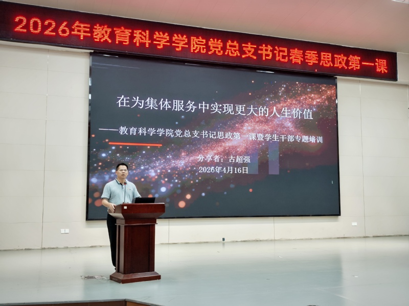 为进一步加强青年学生思想政治教育,引导学生积极调整心态、锤炼本领、勇于担当,2026年4月16日,教育科学学院顺利开展2026年春季思政第一课。学院党总支部书记古超强担任主讲,课程主要围绕自我成长、价...